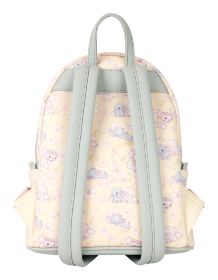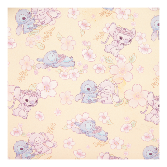 This accessory features a print of charming moments between Stitch and Angel, among the flowers. Scalloped applique trim follows the edge of the front-zipped pocket, and a silicone charm of a cherry blossom tops off the look. There’s enough room for packing just what you need for a fun-filled day of sweet adventures.
